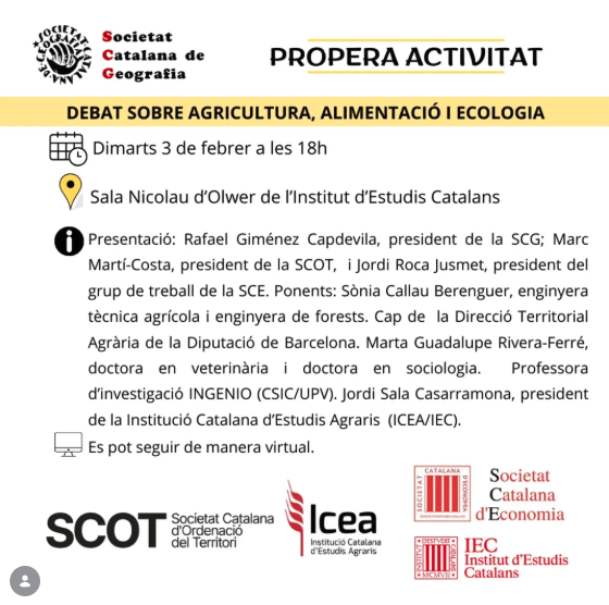 Debat sobre agricultura, alimentació i ecologia 📅 Dimarts 3 de febrer, a les 18.00 h📍 IEC – Sala Nicolau d’Olwer El sistema agroalimentari actual es troba en el centre del debat internacional. La necessitat d’alimentar una població creixent, reduir els