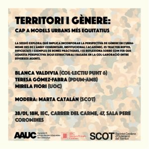 La SCOT us convida a participar en la pròxima sessió del nostre cicle de debat sobre urbanisme i equitat de gènere. Aquesta activitat explora com la perspectiva de gènere pot incorporar-se a l’urbanisme des dels àmbits comunitari, institucional i acadèmic. Parlarem de reptes, dificultats i bones pràctiques, i reflexionarem sobre com construir processos estructurals i col·laboratius.